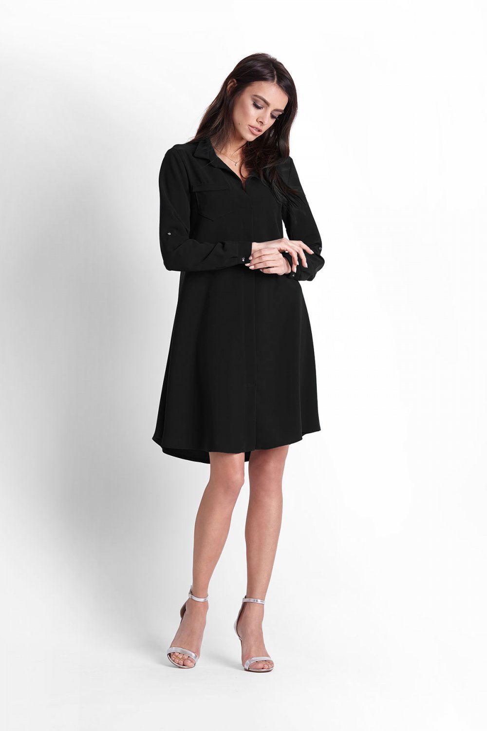 Sukienka posiada koszulową górę – posiada standardowy kołnierzyk i dekolt w kształcie litery V.