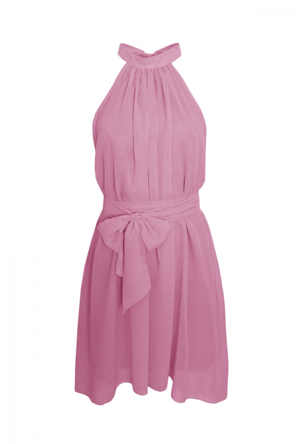 Szyfonowa, zwiewna sukienka z dekoltem typu halter z niewysoką stójką. Trapezowy fason zamaskuje niedoskonałości sylwetki, dzięki temu nasza sylwetka stanie się bardziej atrakcyjna.