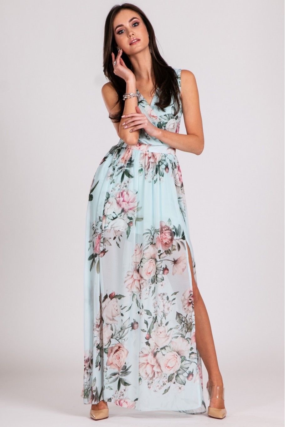 Wzorzysta maxi sukienka z rozcięciem na nodze D04