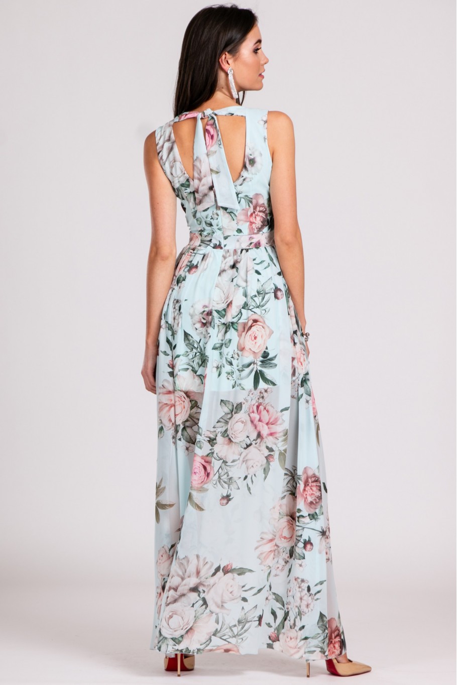 Sukienka maxi w modnym princie z kopertowym dekoltem, wiązaniem na plecach i rozcięciem przy nodze. Zapinana na zamek, spódnica podszyta jest halką. Polska produkcja. Modelka ma 174 cm wzrostu i nosi rozmiar 34.